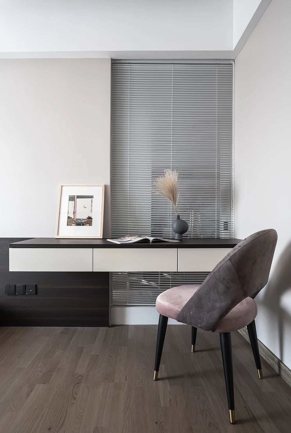 一幅粉色系壁畫猶如點睛之筆,更添一抹藝術氣息。極簡線型燈,高級且有質。