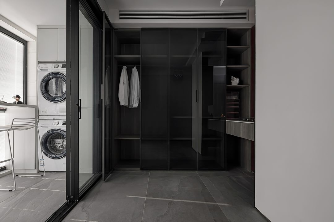 衣帽間氣質(zhì)低調(diào),深色玻璃柜門盡顯神秘感,整體空間呈現(xiàn)精致簡約的視覺效果。從衣帽間通往主臥室的隱形門,采用了與墻體無縫對接的隱框門設(shè)計,刷上與墻面一體的藝術(shù)涂料,視覺上整體性更強,極簡的造型讓空間更加干凈利落。