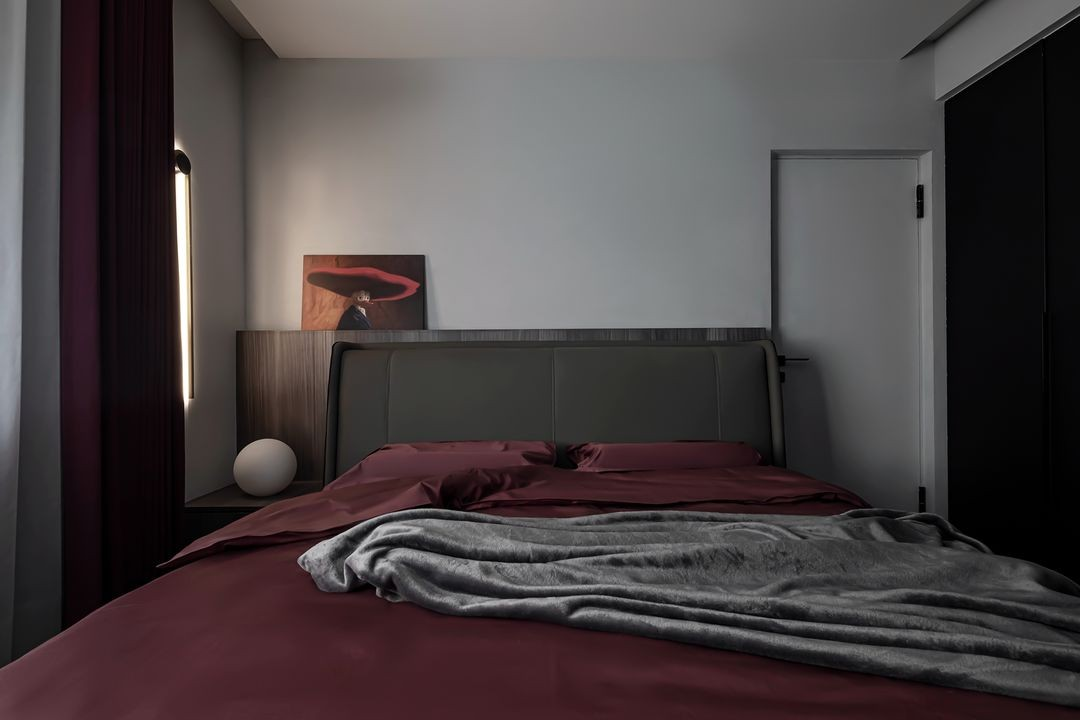 空間布局張弛有度,主臥室空間一如既往的深沉,整體黑白灰的空間里,同樣的那一抹紅,給人強烈的視覺沖擊增加了空間的暖意。